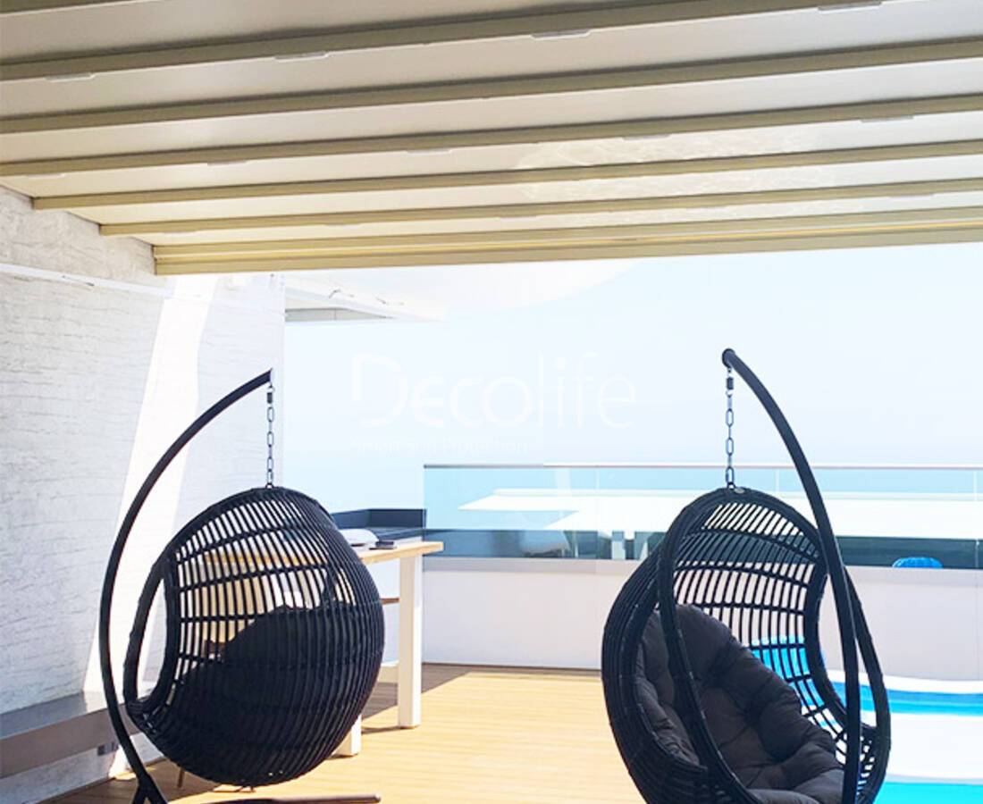 Пергола называется биоклиматической, поскольку подходит для использования в жару, в непогоду и при любых других условиях. Это объясняется возможность установки ламелей крыши в подходящее положение. При закрытии аэродинамические элементы создают поверхность, которая защищает террасу от солнечных лучей и не пропускает дождевую воду. В хорошую погоду крышу можно открывать как частично, так и полностью.