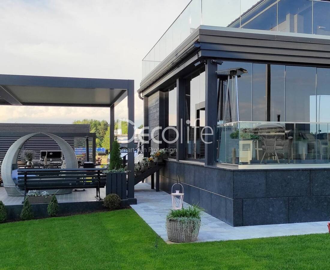 Пергола Decolife B600 PIR + Фасадные жалюзи FZ-44 + Гильотинное W500 и раздвижное S200 остекление - г. Минск